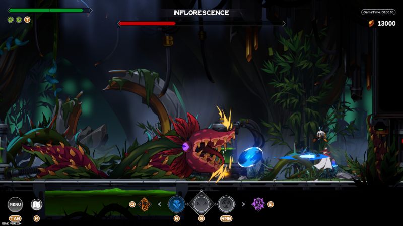 Что действительно выделяет игру — это свобода передвижения, доступная почти с самого начала. Вместо традиционного для метроидвании постепенного открытия способностей вы быстро получаете весь арсенал для паркура, что превращает каждый уровень в головоломку из прыжков, рывков и переключений оружия на лету. Однако баланс хромает: прокачав один тип атак, можно с лёгкостью крушить даже боссов, а система морального выбора (добрый/нейтральный/злой вариант реакции) кажется скорее декорацией, чем глубоким механизмом.