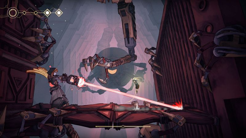 Геймплей требует точности, ритма и терпения: двойные прыжки, крюк-зацеп и способность цепляться за стены превращают каждое передвижение в балет над пропастью. Смерть обходится дорого – вы теряете накопленный кристаллический ресурс «нэкр», если не успели его закрепить в специальных терминалах. Более 30 типов врагов и 15 боссов-стражей проверяют не только реакцию, но и умение комбинировать модификаторы, меняя стиль игры: от уклонения и тактики до прямой агрессии.